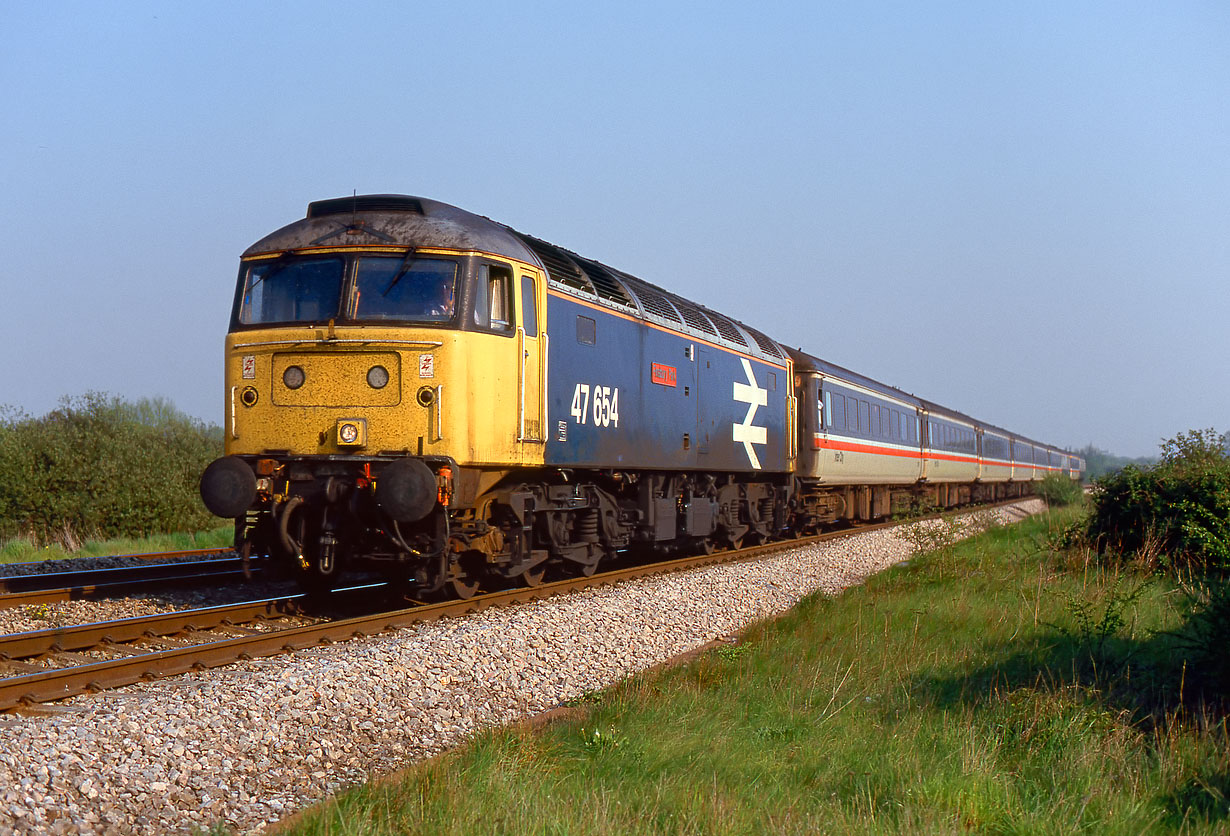 47654 Finsbury Park passes Wolvercote on 4 May 1989 with the 1M61 16:57 Paddington to Derby service. This loco was numbered 47654 between August 1986 and July 1989. Previously it had been D1640, and then 47056. After July 1989 it became 47809, and then in April 1994, 47783. |