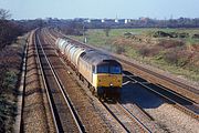 56015 pulls away from a signal check as it approaches Oxford from the south on 29 October 1982. Due to line capacity issues, trains frequently stopped at this signal in the 1980s. The train is the early running 6M56 11:40 Didcot Power Station to Daw Mill Colliery MGR empties. |