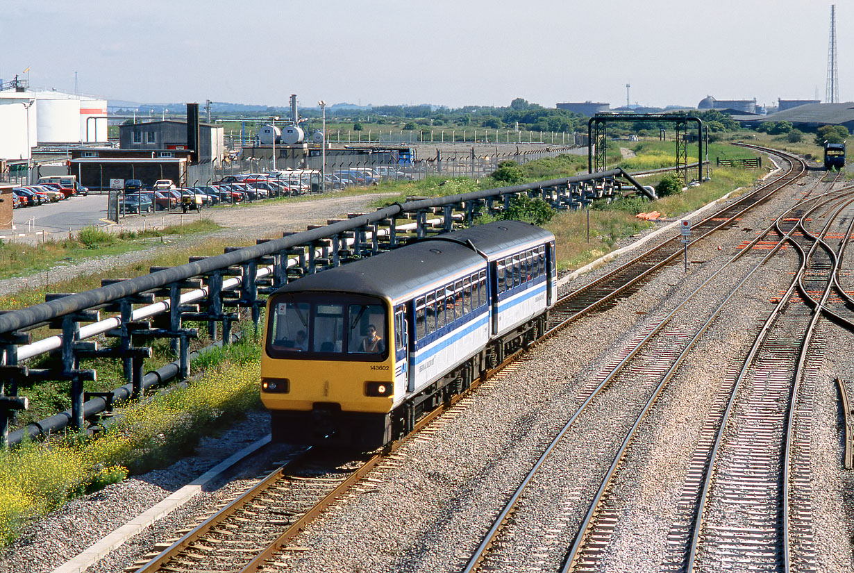 143602 passes Hallen Marsh Junction on 25 June 1993 with the 08:52 Severn Beach to Bristol Temple Meads Regional Railways service. Considerable track rationalisation had just taken place here, with most of the former connections between the freight lines, and the Severn Beach route removed. |