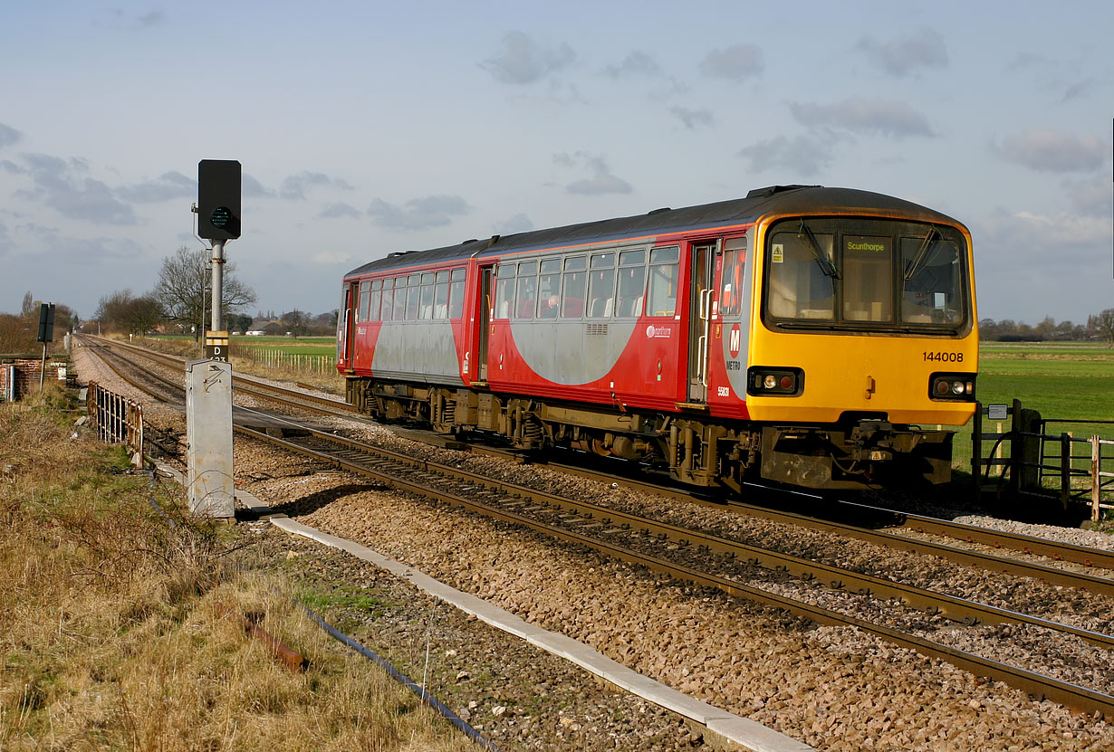 144008 passes Maud's Bridge on 13 March 2008 with the 2R63 09:25 Sheffield to Scunthorpe Northern Rail service. Note that the only indication of the new operator's ownership is the subtle Northern Rail logo underneath the first passenger window, otherwise the livery is the obsolescent Metro colour scheme. |