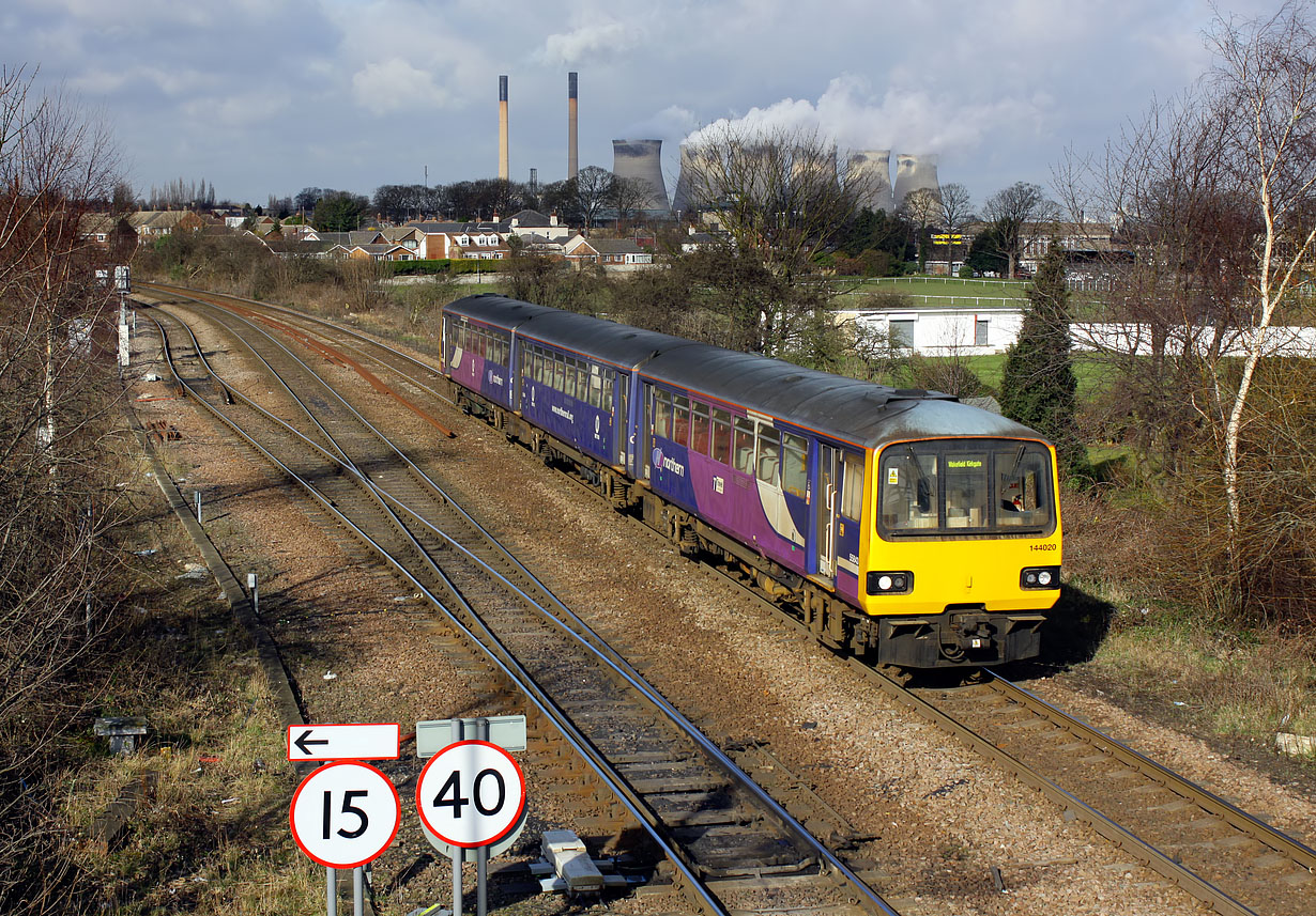 After arriving at Knottingley on 11 March 2011 with the 2F09 09:00 Northern Trains service from Leeds, 144020 passes England Lane, just around the corner from the station. A few hundred yards further on it will reverse and head back towards the station, where it will form the 2F66 09:53 departure to Wakefield Kirkgate. Note that the driver has already changed the destination blind. |