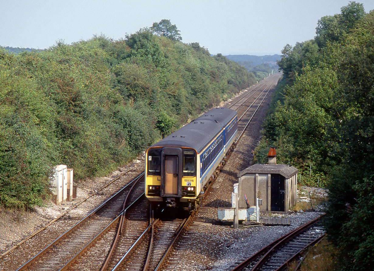 155316 passes East Grimstead on 10 September 1991 with the 13:05 Brighton to Cardiff Central Regional Railways service. Note the ground frame controlling entry to the quarry siding, and the typical precast concrete Southern Railway PW hut.