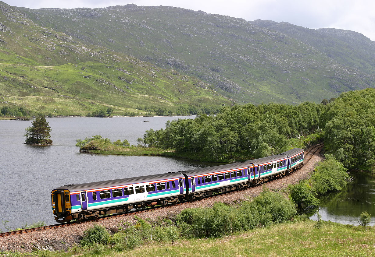 156447 & 156492 pass the western end of Loch Eilt on 11 June 2005 with the 08:21 Glasgow Queen Street to Mallaig ScotRail service. There are just four scheduled trains on this route on a weekday, and one of those runs in the dark!