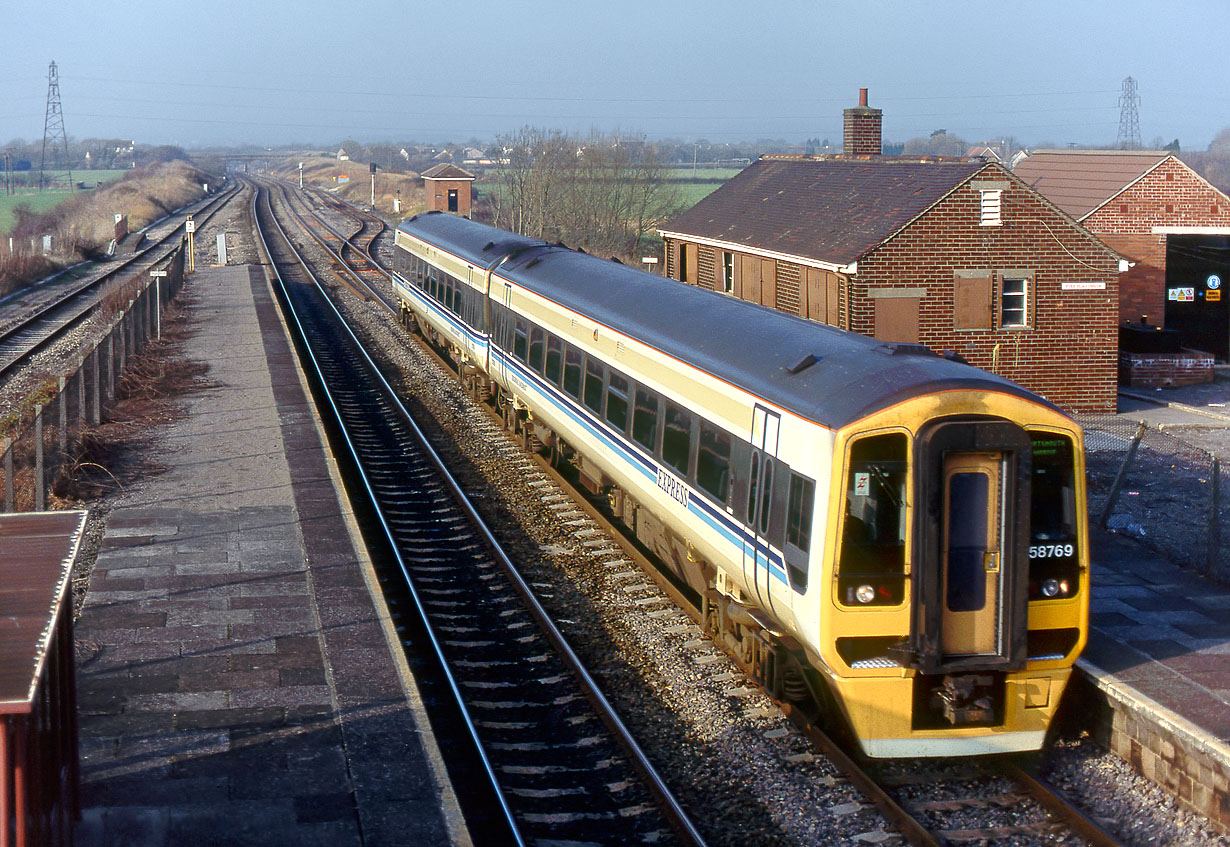 158769 races through Pilning station on 16 January 1992 with the 11:29 Cardiff Central to Portsmouth Harbour Regional Railways service. This viewpoint no longer exists, as Network Rail removed the footbridge from which it was taken in 2016, due to forthcoming electfrication works. This effectively means that passengers can travel in one direction only. Yet another benefit of electfrication! |