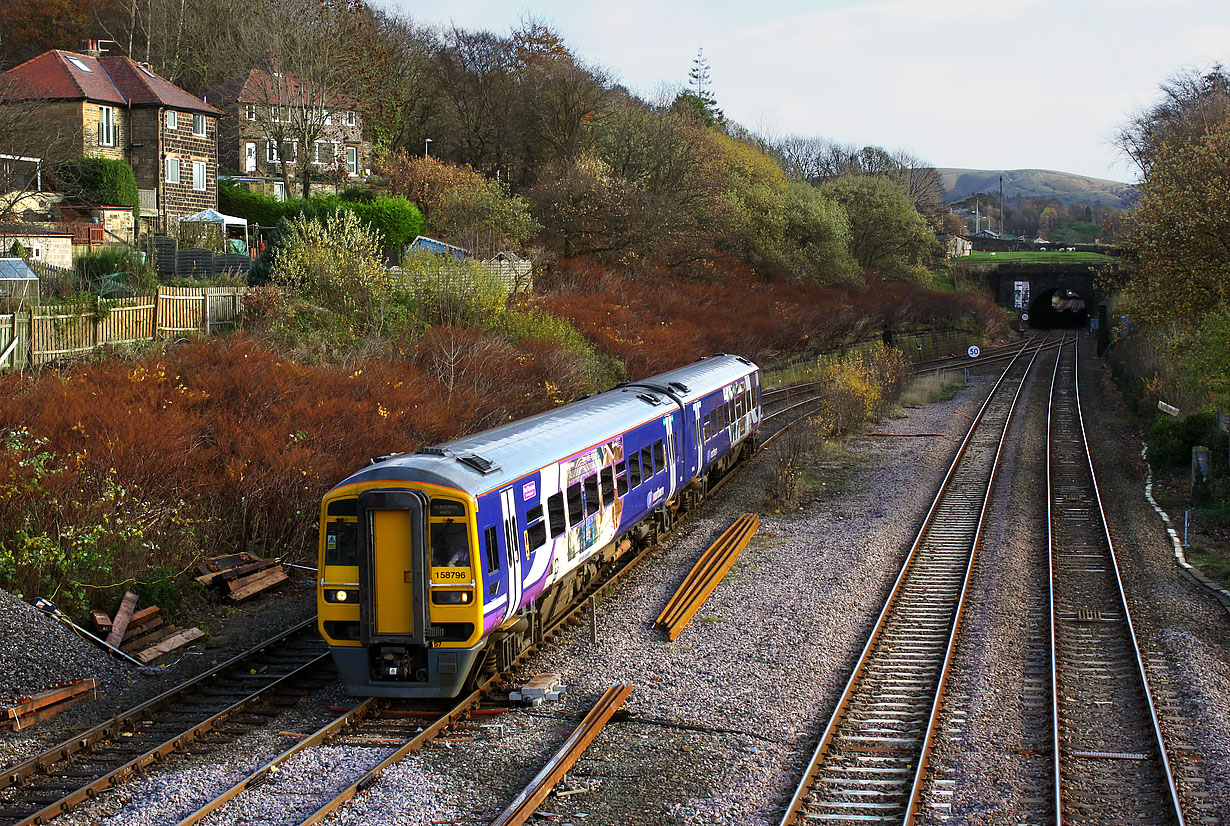 158796 Fred Trueman - Cricketing Legend takes the Copy Pit route at Hall Royd Junction on 16 November 2015 with the late running 1B14 08:27 York to Blackpool North Northern service. In the background is the 225 yard long Millwood Tunnel.