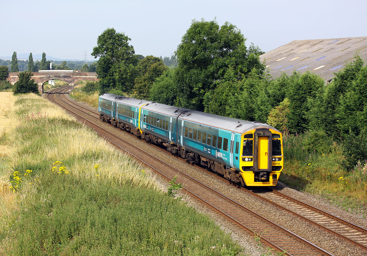 158832 & 158823 pass Walcot on 26 July 2014 with the 1G15 07:30 Aberystwyth to Birmingham International Arriva Trains Wales service. Only one of the units would have originated from Aberystwyth, the other would have joined it at Machynlleth, after arriving with the 2G15 06:46 from Barmouth. |
