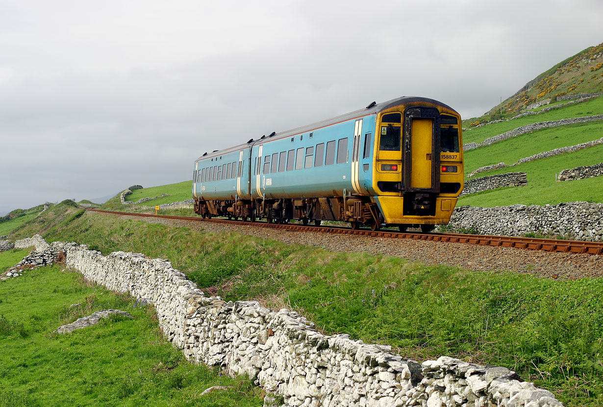 158837 heads away from the camera at Llangelynin (between Tywyn and Barmouth) on 20 May 2006 with the 14:33 Birmingham New Street to Pwllheli Arriva Trains Wales service. The ground slopes away abruptly to the left towards Cardigan Bay.