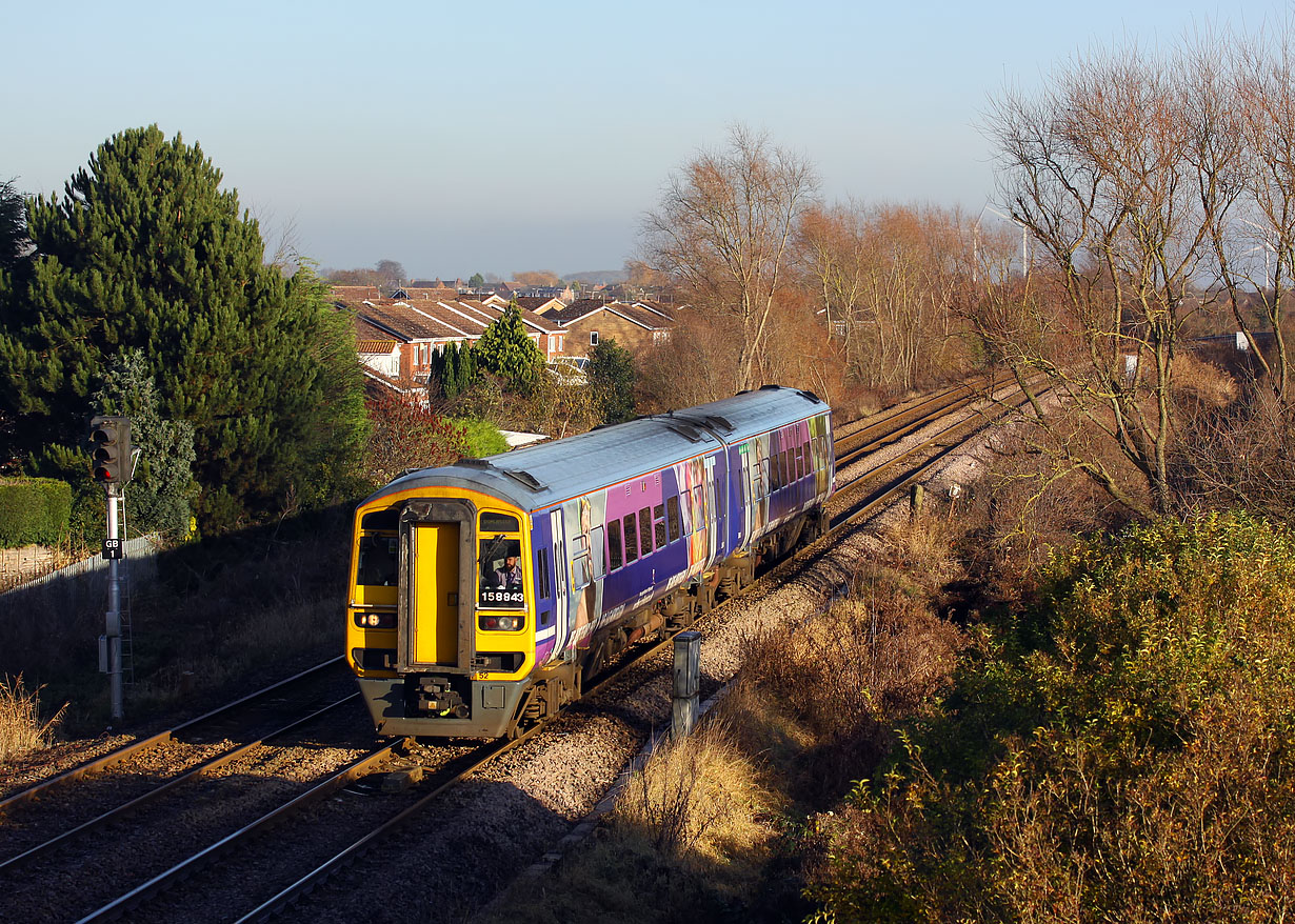 158843 approaches Goole on 17 December 2016 with the 2C43 11:23 Hull to Doncaster Northern service. Note the advertising vinyls, which partly cover the windows. Obviously Northern don't consider being able to look out of the window as being very important! |