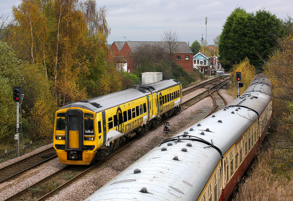 The unique Tour de France yellow liveried 158849 departs from Goole station on 14 November 2015 with the 1J26 11:11 Bridlington to Sheffield Northern service. The wording on the side reads: 'We Took You To The Tour'. It formerly read: 'Taking You To The Tour'. In the foreground is the equally unique spectacle of a passenger train in the Goole Docks branch headshunt. This is the UK Railtours 1Z25 07:14 Finsbury Park to Goole Docks 'Galloping Goolie' railtour. 66206 can just be seen amid the silver birch bushes. |