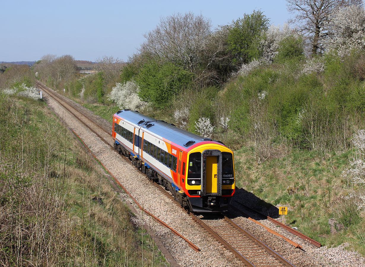 Blackthorn blossom in abundance at Oaksey on 8 April 2011 as hired in South West Trains 158882 passes by with the 2B94 13:40 Cheltenham to Swindon First Great Western service. Note the young ash trees growing up in the foreground. How long before this viewpoint disappears? |