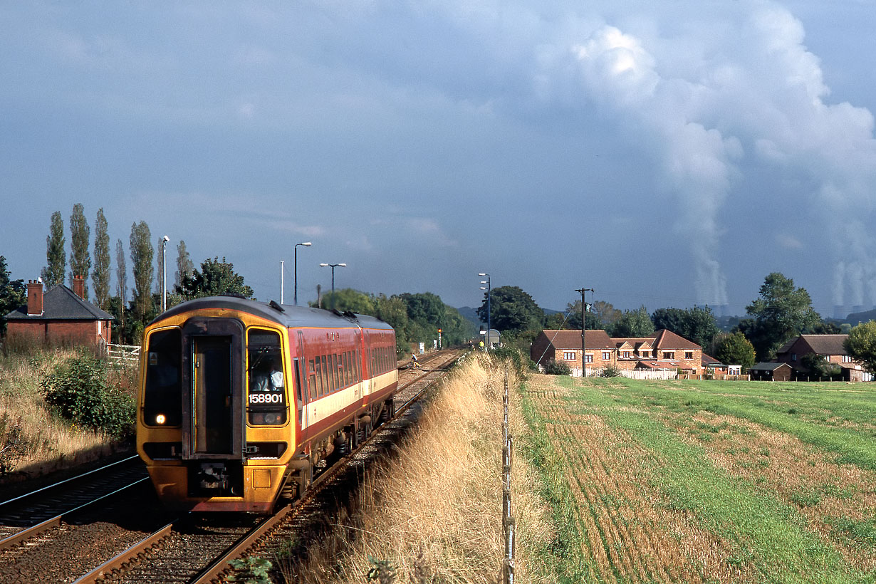 158901 accelerates away from South Milford station on 25 September 1999 with the 14:54 Selby to Manchester Victoria Regional Railways North East service. The off centre framing, with the inclusion of lots of sky, is deliberate. A sudden burst of sunshine was contrasting markedly with the dark clouds, and I also wanted to include Drax Power Station in the background, which was as usual throwing up huge columns of water vapour into the atmosphere. |