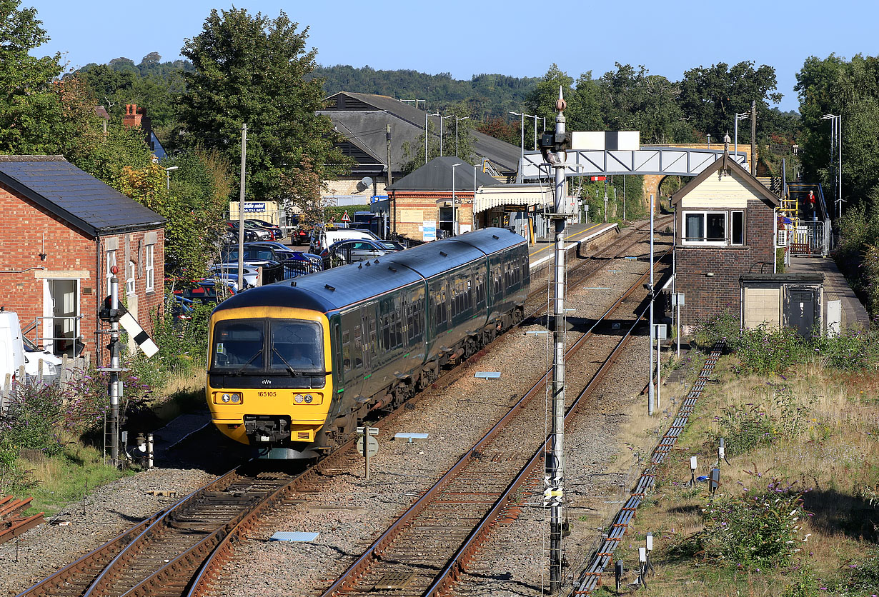 165105 leaves Moreton-in-Marsh station on 13 September 2018 with the 1P23 09:50 GWR service to Paddington. The unit had arrived a little earlier as one half of the 1W16 07:50 Paddington to Great Malvern. The front unit then detached, and carried on to Great Malvern. This explains why the train is leaving from the 'wrong' platform. This telephoto view clearly shows the newly installed semaphore signal that allows this move. The crossover just in front of the unit will allow the train to gain the correct line. |
