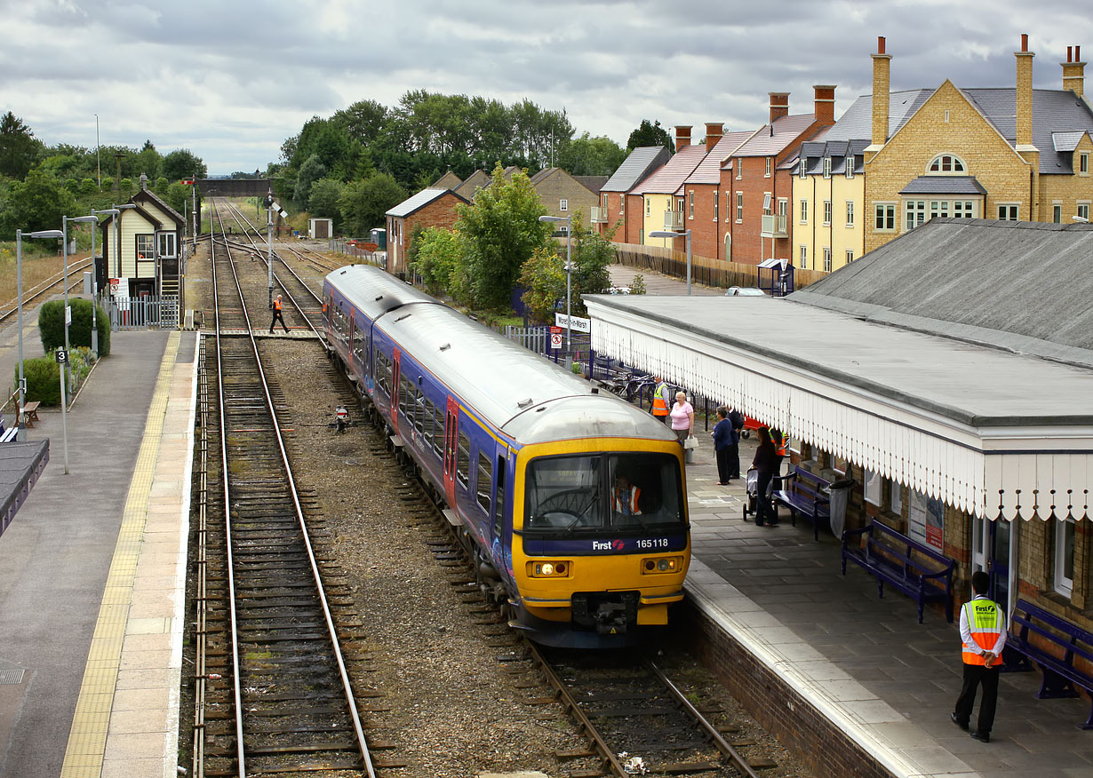 165118 arrives at Moreton-in-Marsh on 15 August 2009 with the 10:21 First Great Western service from Paddington. Ordinarily this would continue through to Hereford, but as the line between here and Evesham is being prepared for redoubling, buses would ferry passengers from here onwards. This would explain the high number of First Great Western employees who can be seen wandering about the station. Unfortunately the litter on the track is an all too common problem nowadays, as presumably nobody has done a risk assessment on the dangers of somebody going down onto the track to remove it! |