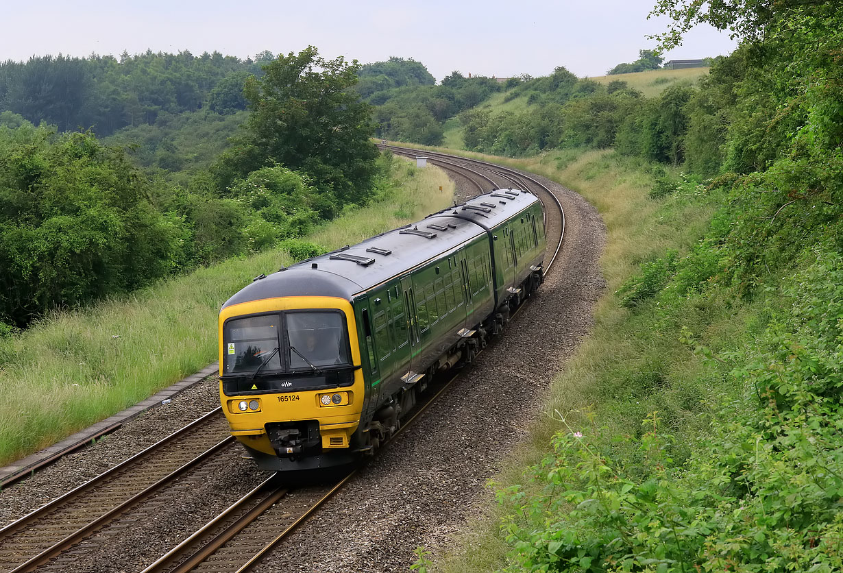 165124 rounds the curve north of Tackley on 30 June 2021 with the 2M10 07:34 Didcot Parkway to Banbury GWR service. The unit is still accelerating away from Tackley station, which is just around the corner, behind the trees.