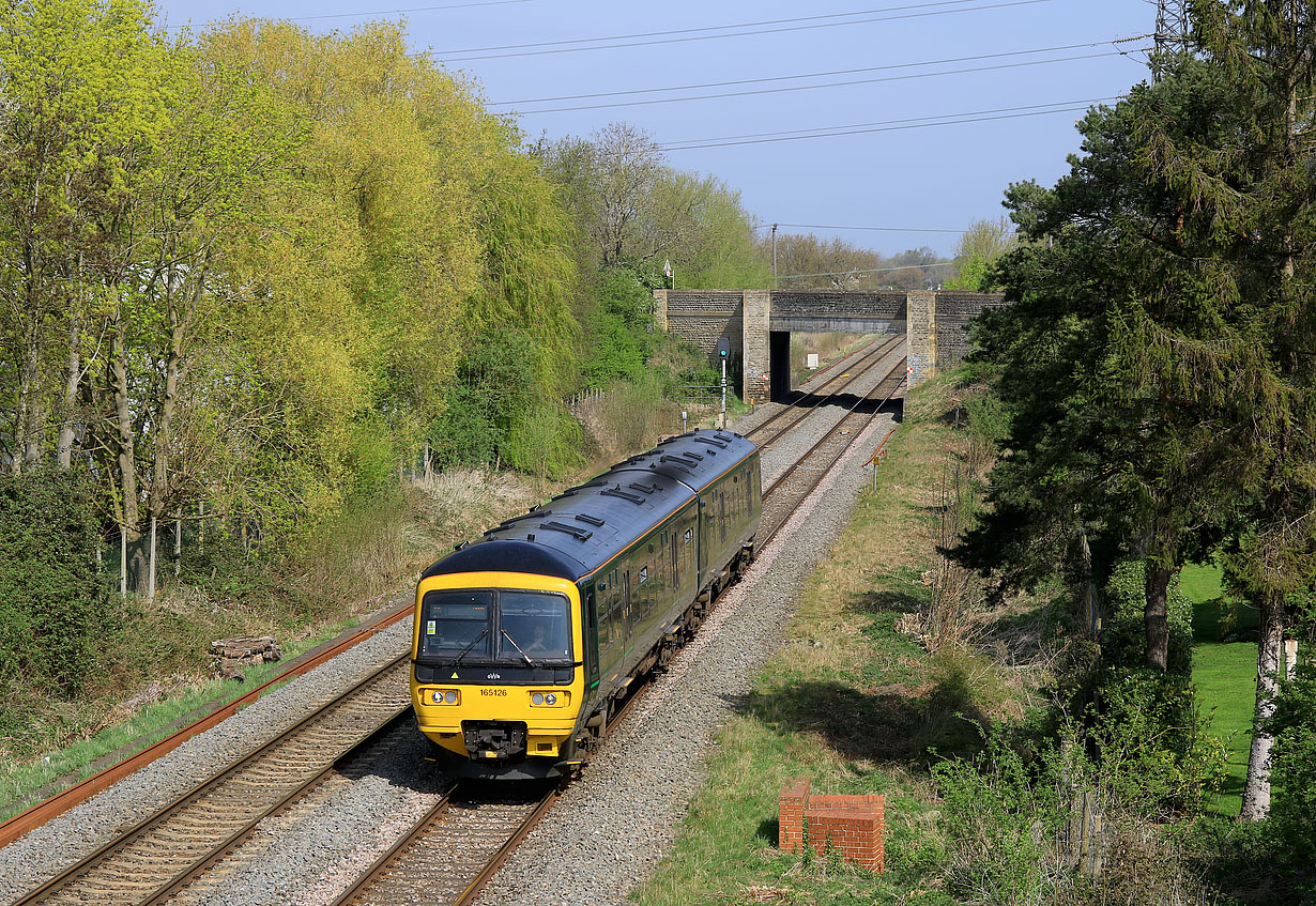 165126 passes Yarnton on 16 April 2022 with the 2V15 11:08 Banbury to Didcot Parkway GWR service. Judging by the style of the A44 bridge in the background, I would assume it dates from the 1930s, when the nearby Oxford northern bypass was constructed. |