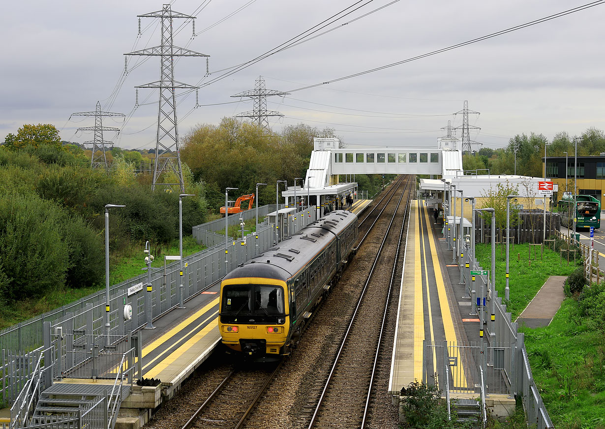 165127 arrives at Reading Green Park station on 12 October 2024 with the 2J24 10:23 Basingstoke to Reading GWR service. Not the most photogenic location, with numerous high voltage lines converging on a nearby substation.
