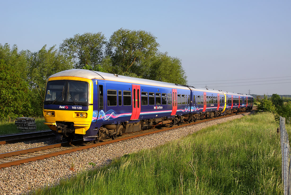 A pair of two car Class 165/1s join forces to work the 2M56 17:24 Paddington to Banbury First Great Western service on 6 June 2013. 165129 & 165135 pass Kennington in superb evening light. These units would still have one more visit to the capital, before finally completing their day's work on arrival at Oxford Carriage Sidings at midnight. |