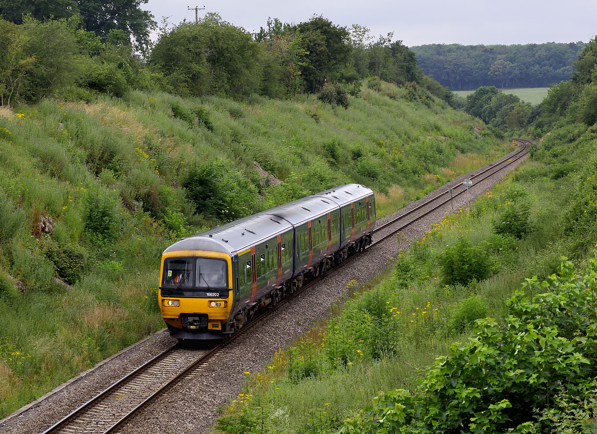 166202 approaches Hanborough on 9 July 2016 with the 1P47 12:06 Worcester Foregate Street to Paddington GWR service. This cutting was cleared if vegetation in late 2014, but the new growth is already starting to return the line to its former state.