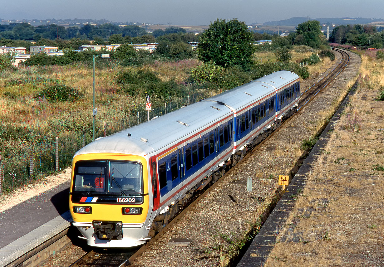 Honeybourne station has changed considerably since this picture was taken on 8 August 1995. The track has been redoubled, and both platforms are now in use, connected by a large footbridge. The field on the left is now covered with houses, and an extended station car park. 166202 heads away from the camera with the 2F02 07:09 Oxford to Worcester Foregate Street Network SouthEast service, the first down train of the day at the time. |