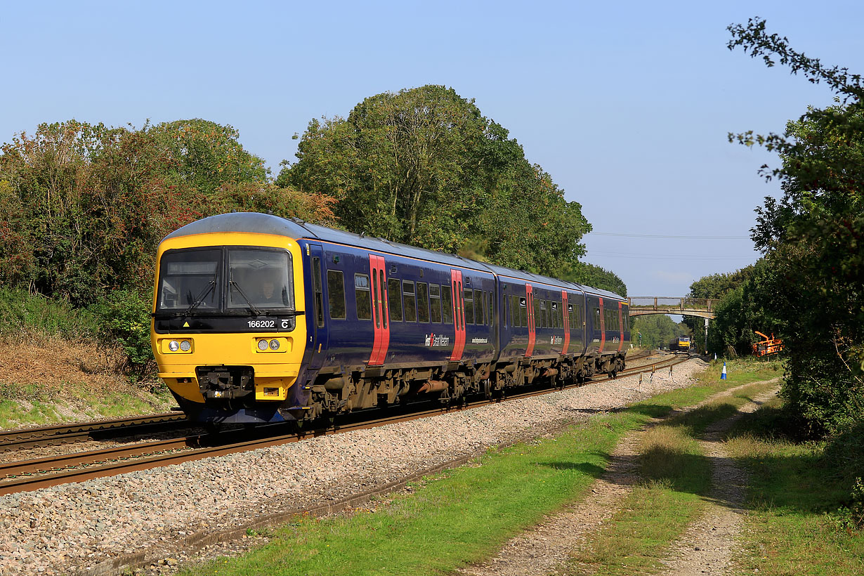 166202 passes Little Haresfield on 19 September 2020 with the 1O98 10:52 Great Malvern to Brighton GWR service. Waiting in the loop in the background is 60074 Luke with the 6B13 04:19 Robeston to Westerleigh oil tanks. I was slightly surprised that I haven't had to clone anybody out in Photoshop from the bridge in the background, as despite the encroaching vegetation, the bridge is a very popular spot with photographers, and now it is again wearing a distinctive livery, 60074 Luke is a very popular locomotive! |