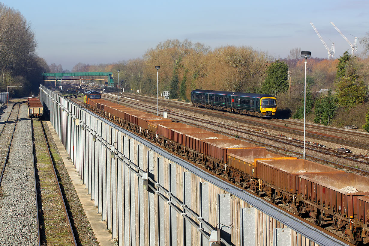 A scene full of interest at Hinksey Yard on the gloriously sunny afternoon of 20 January 2016. 166204 Norman Topsom MBE passes by with the 1P43 11:22 Worcester Shrub Hill to Paddington GWR service, while parked on the left, in an unphotographable position, is 60047. A new footbridge is under constriction in the background, just in front of the concrete and wire mesh sided bridge, that even three decades ago looked to be in very poor condition. The prominent feature in the foreground is a noise barrier, designed to shield the ballast sidings on the left. Finally, two cranes can be seen in the background working on the new Westgate Shopping Centre. Luck would have it that they both happened to be positioned ideally for this photo. |