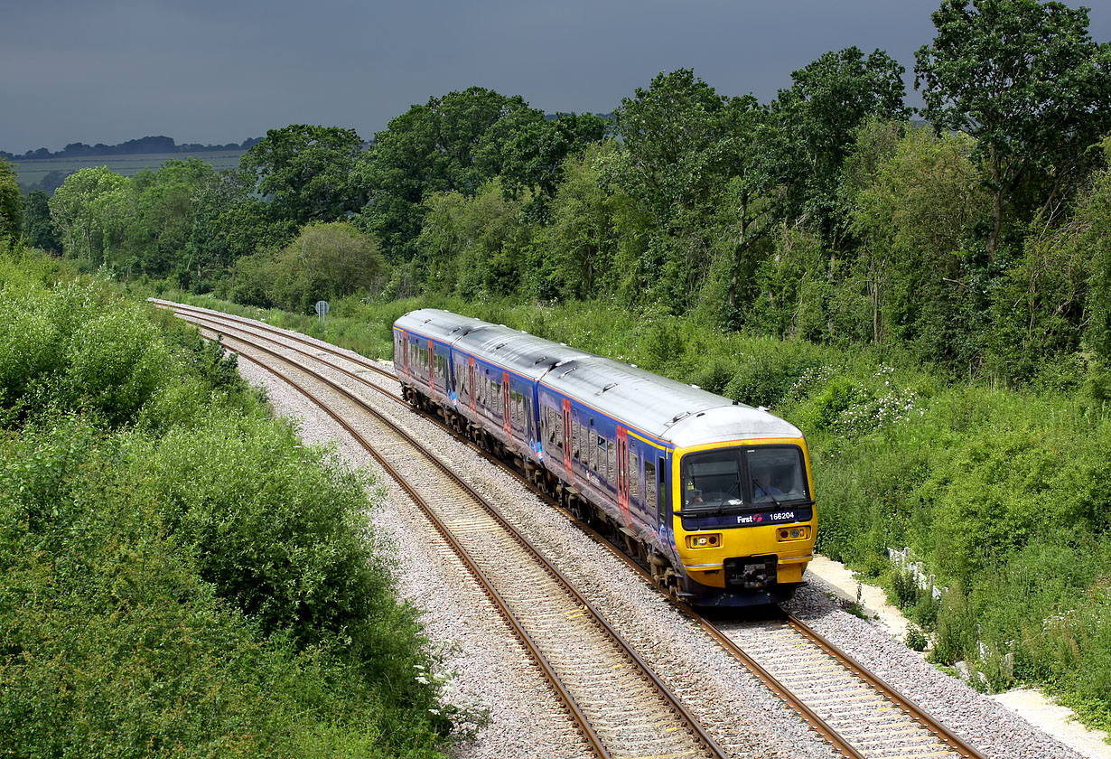 Dramatic lighting at Shorthampton on 28 June 2012. Although it looks like the sun is about to disappear behind that huge brooding mass of dark cloud, it did in fact stay out long enough to provide some nice illumination for Tornado, which was coming from the other direction with the 'Cathedrals Express' railtour. 166204 is seen here working the 1P43 11:50 Moreton-in-Marsh to Paddington First Great Western service. This proved to be a good choice of location, as not only did the sun co-operate, but the dark clouds gives a hint of the terrible weather, including some unbelievably heavy downpours that was happening further west. |