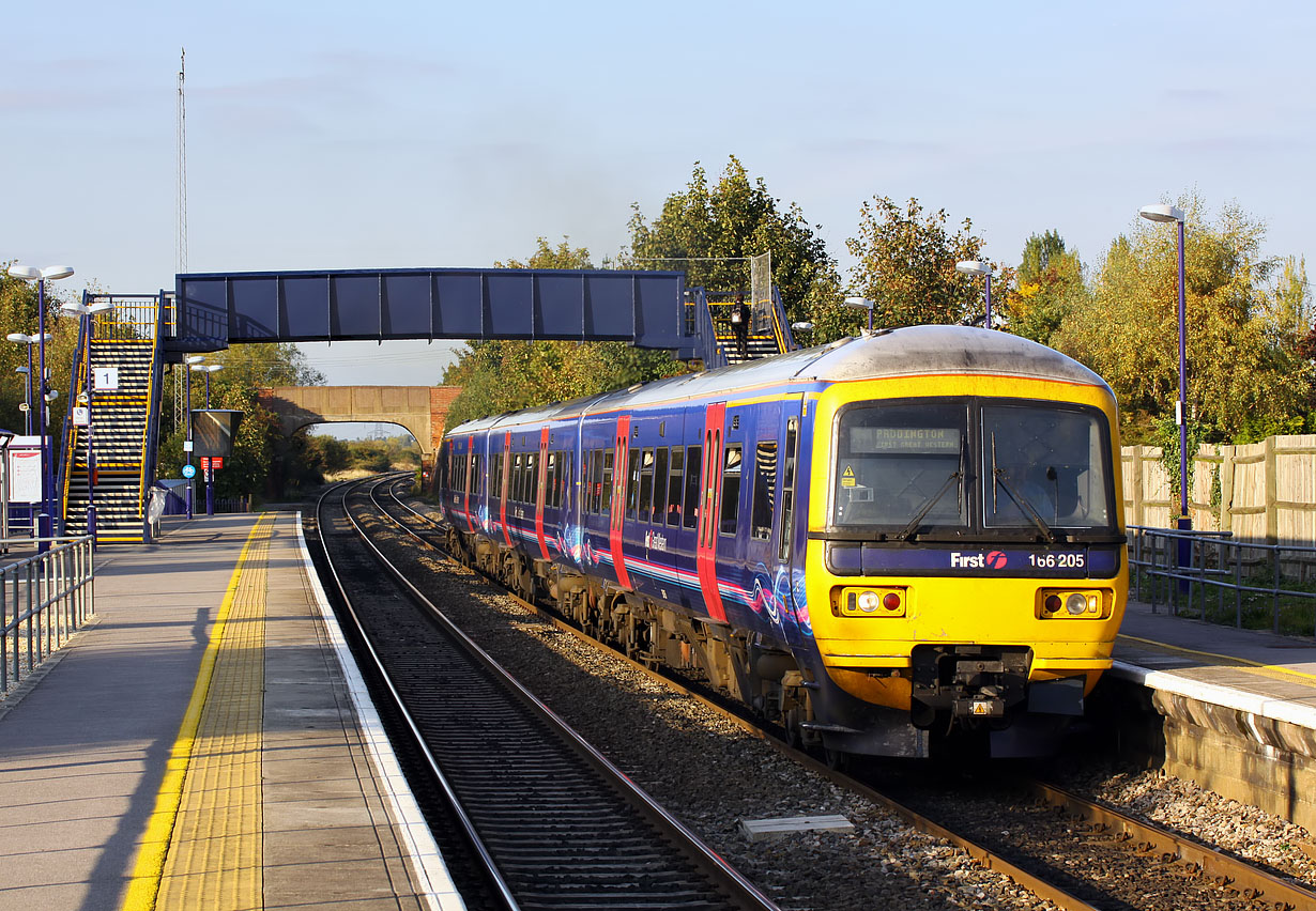 166205 calls at Radley on 8 October 2009 with the 2P68 16:37 Oxford to Paddington First Great Western service. Plenty of autumn colours on the trees, which have enveloped the road bridge in the background considerably since I started taking pictures here in the early 1980s. |