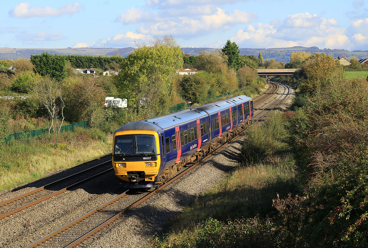 166207 passes Badgeworth in superb autumnal light on 22 October 2019 with the 2O90 12:51 Great Malvern to Weymouth GWR service. One third of the 21 strong Class 166 fleet were lucky enough to receive First Great Western's revised plain blue colour scheme in 2015, and therefore escaped the later mass repainting into GWR's drab green livery. |