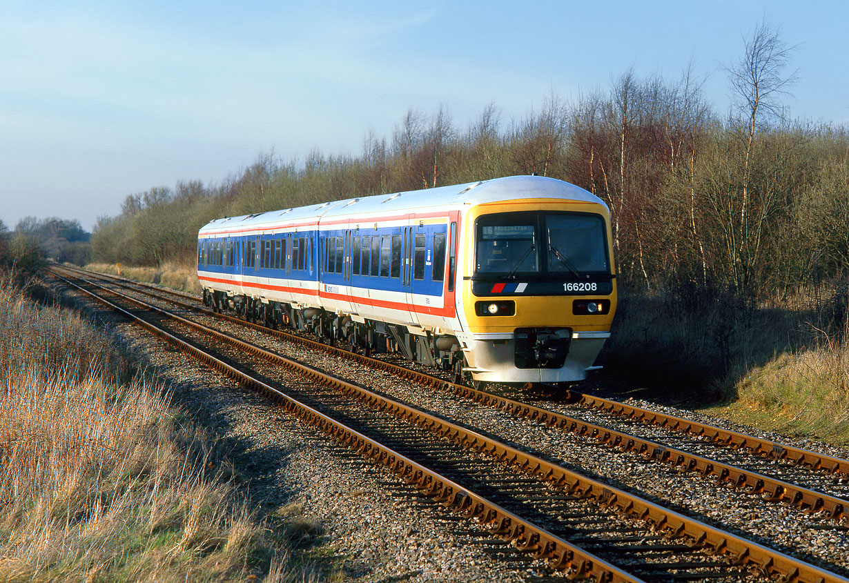 166208 approaches Kingham on 12 March 1995 with the 15:32 Worcester Shrub Hill to Paddington service. Although this section of the Cotswold Line, in contrast to much of the route, avoided being singled in 1971, for a long time it retained 95lb per yard bullhead track, as seen here. Since this picture was taken not only has this vintage track been replaced, but also 166208 has lost its Network SouthEast livery. Unfortunately, this viewpoint is nothing like as clear of vegetation now either! |