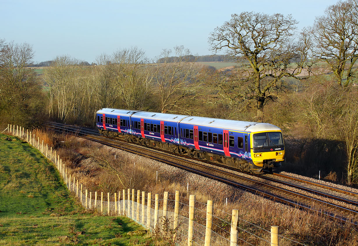 The low winter sunlight provides perfect illumination for 166208, as it passes Shorthampton on 6 January 2012 with the 1P35 08:26 Worcester Foregate Street to Paddington First Great Western service. It is travelling over the recently reinstated double track, and makes an interesting comparison to 166206 pictured from a similar viewpoint a few months previously. |