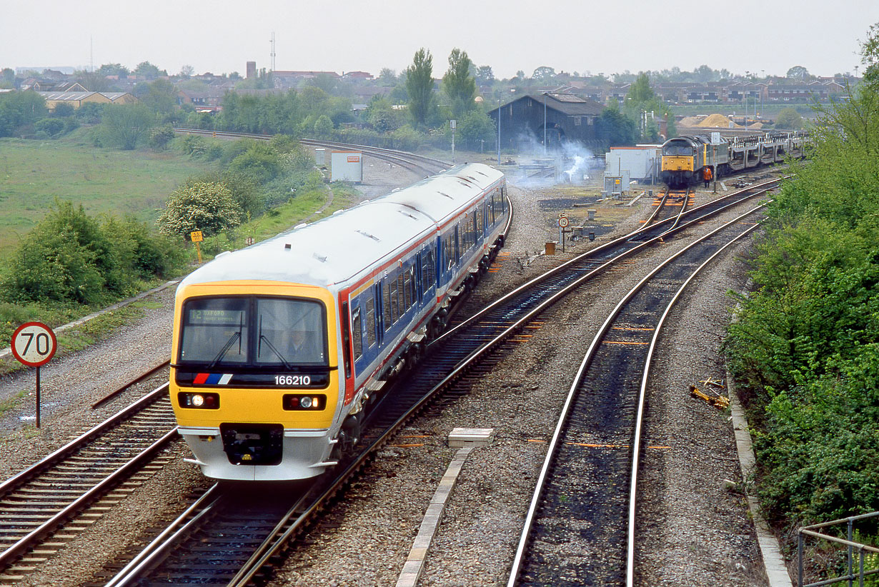 166210 passes Didcot North Junction on 6 May 1994 with the 1F16 09:48 Paddington to Oxford Network SouthEast service. It has just traversed Didcot East Curve, which allows non-stop trains such as this to avoid Didcot Parkway station. There are some strange goings on in the background. 47145 Merddin Emrys, which had arrived a little earlier with the 6V03 MoD stores from Fenny Compton, can be seen attached to the front of 47307 on a train of cartics. However, it didn't stayed attached for long, and headed off north light engine, leaving 47307 to work the train alone. |