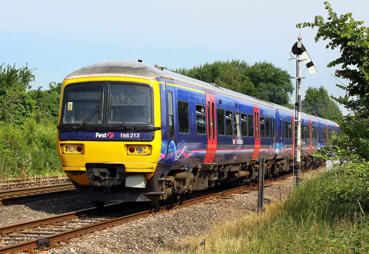 166213 accelerates past Moreton-in-Marsh's up advanced starter signal on 23 June 2010, as it heads south with the 08:58 Great Malvern to Paddington First Great Western service. This picture is taken from a diverted public footpath, which originally used to cross the line at this point (note the old warning sign post). On the extreme left the very rarely used down refuge siding can be seen being slowly overtaken by the lineside vegetation. |