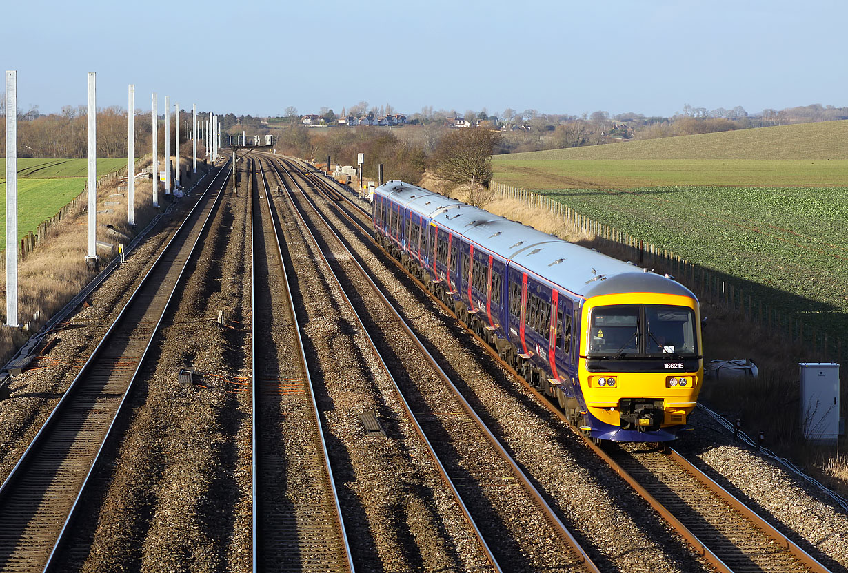 First Great Western's refurbishment of its Turbo DMU fleet is altering the external appearance of these 1990s built units. Most noticeable is the replacement of the hard to keep clean white roof with a much more suitable mid grey colour. Other modifications include a simplified bodyside colour scheme minus the 'wavy line' logos and LED headlamps. Ex works 166215 partners original condition 165101 at Cholsey on 2 January 2015, as they work the 2P54 13:07 Oxford to Paddington service. |