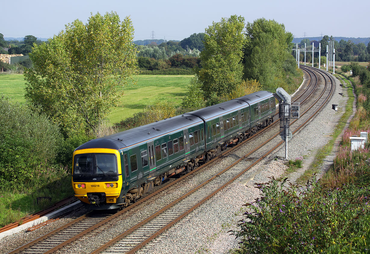 166218 heads away from Didcot North Junction on 28 August 2017 with the late running 2N18 08:27 Paddington to Oxford GWR service. There is just enough room for a going away shot, without the signal getting in the way.