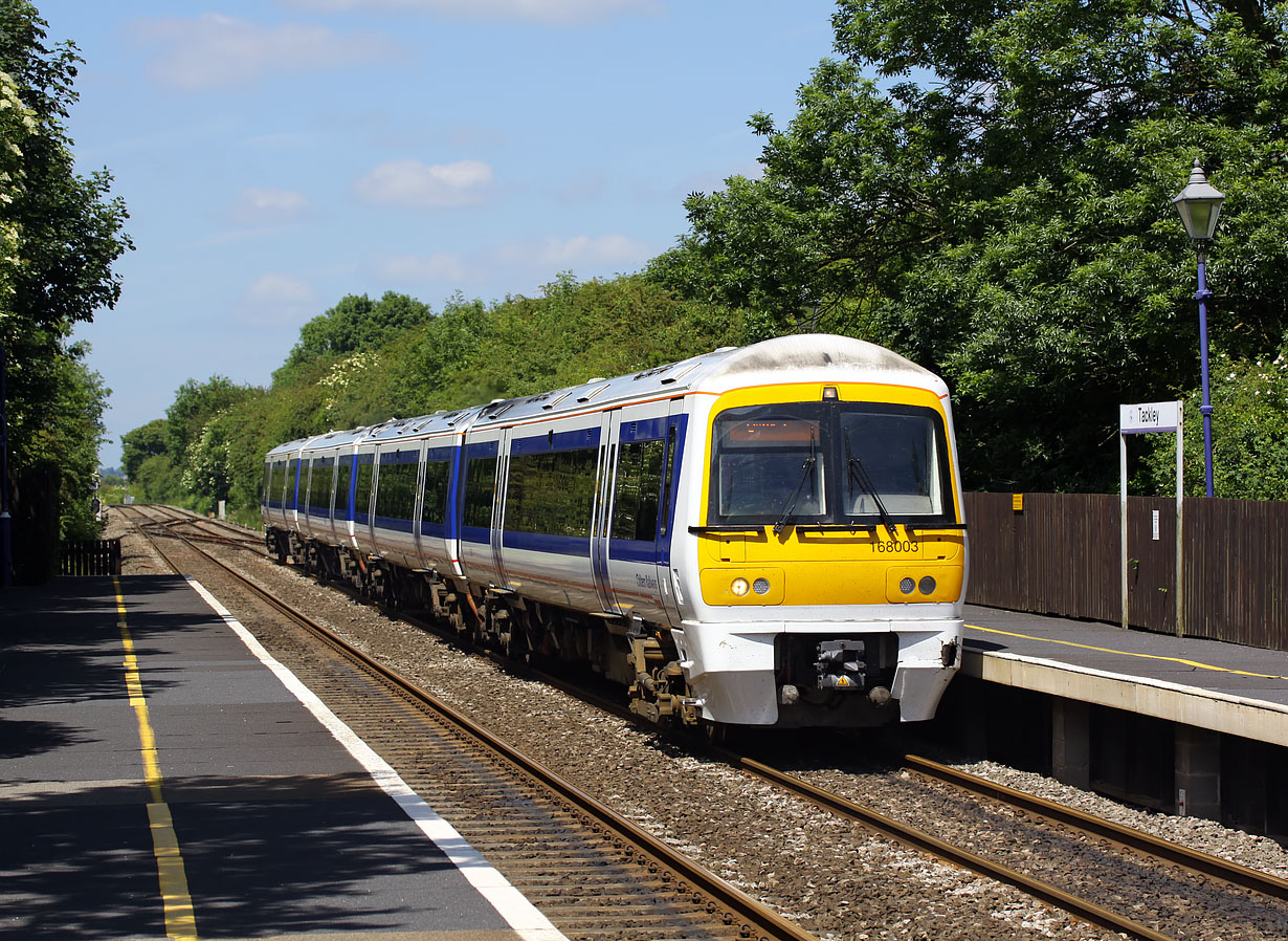 Engineering work on the Chiltern Line on Sunday 20 June 2010 saw a revised service operated by Chiltern Railways from Birmingham to Oxford, to connect with First Great Western trains for London. 168003 speeds through Tackley station with the 1V42 13:10 Birmingham Snow Hill to Oxford service. Obviously the leading vehicle of 168003 will require some cosmetic front end attention soon, as it has presumably hit something chipping a piece off the edge of the faring and punching a large hole on the corner of the moulding. |