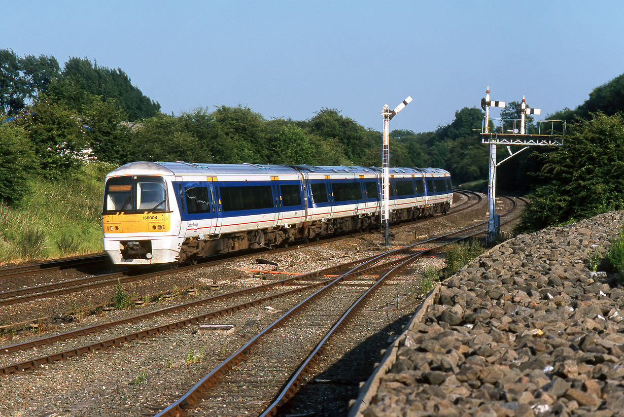 The old and the new at Fenny Compton on 19 June 2000. 168004 works the 17:12 Marylebone to Birmingham Snow Hill Chiltern Railways service, passing the unusual combination of adjacent upper and lower quadrant semaphore signals. Unfortunately these signals disappeared when Fenny Compton box closed in April 2004. |