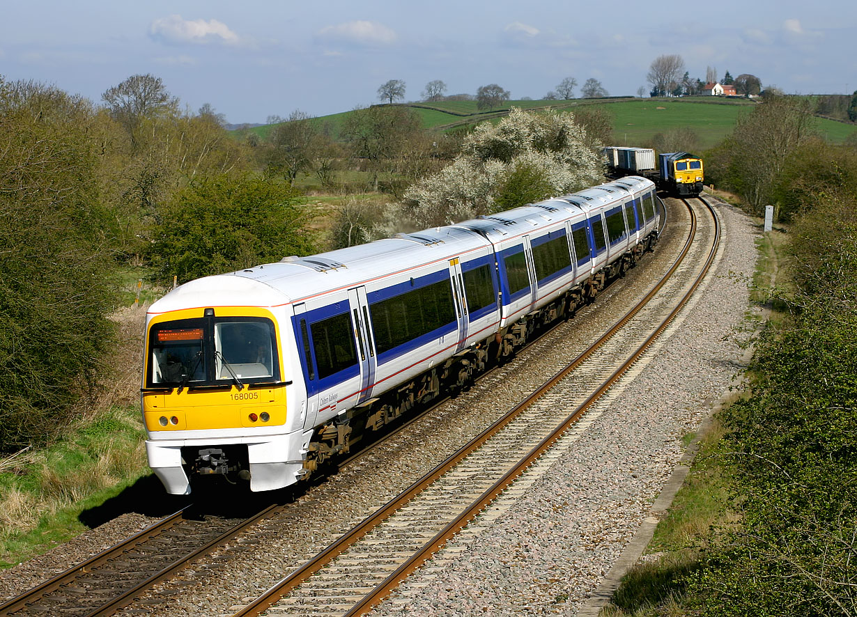 168005 almost gets in the way of the photo at Bishop's Itchington on 15 April 2008, as it heads north with the 09:50 Marylebone to Birmingham Snow Hill Chiltern Railways service. Approaching from the opposite direction is 66568 with the 4O14 04:35 Garston to Southampton freightliner |