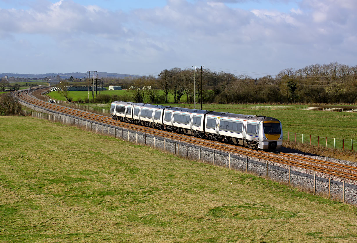 A sweeping new vista, created by the upgrading of the Oxford to Bicester line. 168106 passes Charlton-on-Otmoor on 21 March 2017 with the 1Y27 09:36 Oxford to Marylebone Chiltern Railways service. Islip church can just be seen in the far distance, on the left of the picture. |