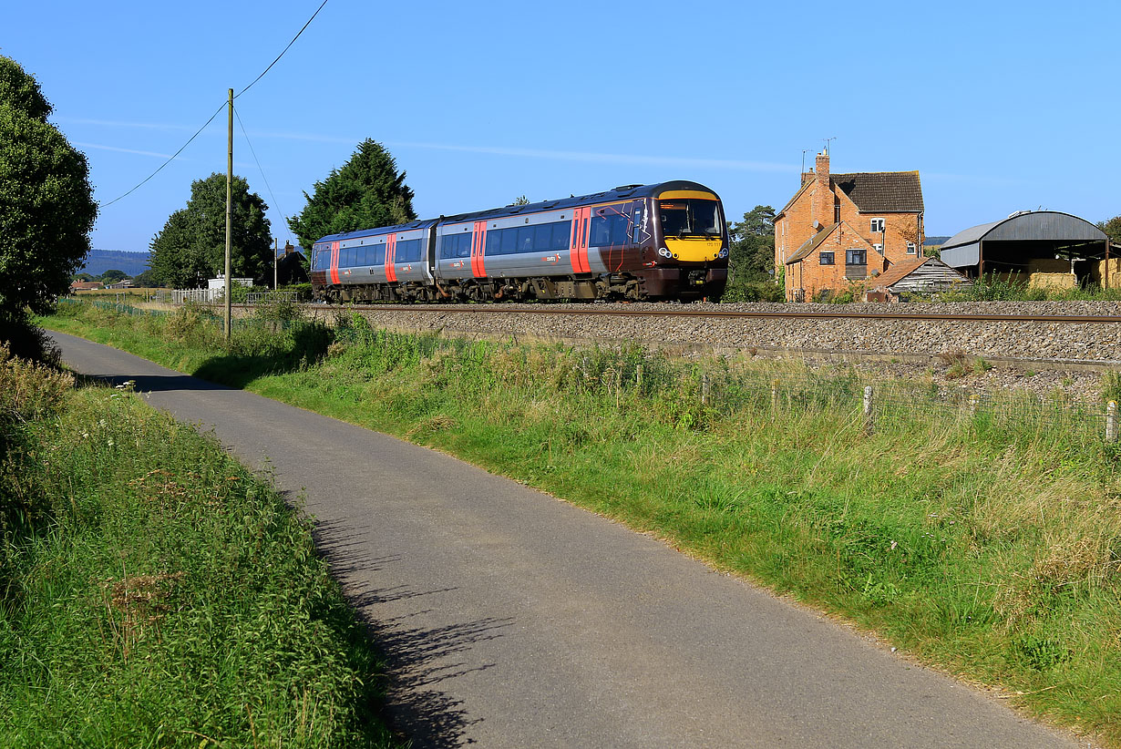 170111 passes Ley Court (between Grange Court and Oakle Street) on 18 September 2019 with the 1M60 09:45 Cardiff Central to Nottingham CrossCountry service. I correctly guessed that there would be just enough room to fit the two car DMU in the gap between the telegraph pole and the farmhouse. I also correctly guessed that the picture would be unlikely to be spoiled by any passing traffic, as the road is a little used country lane. |