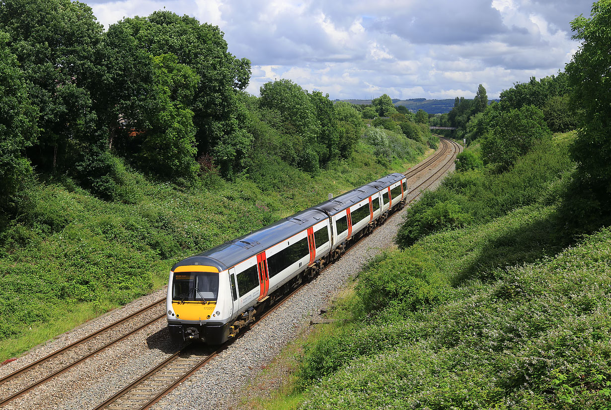170207 passes Up Hatherley on 29 June 2022 with the 2L59 13:46 Cheltenham Spa to Maesteg Transport for Wales service. Of course you can always rely on photographing a DMU in sunshine, before the sun disappears for the rest of the day, and that is exactly what happened on this occasion! |