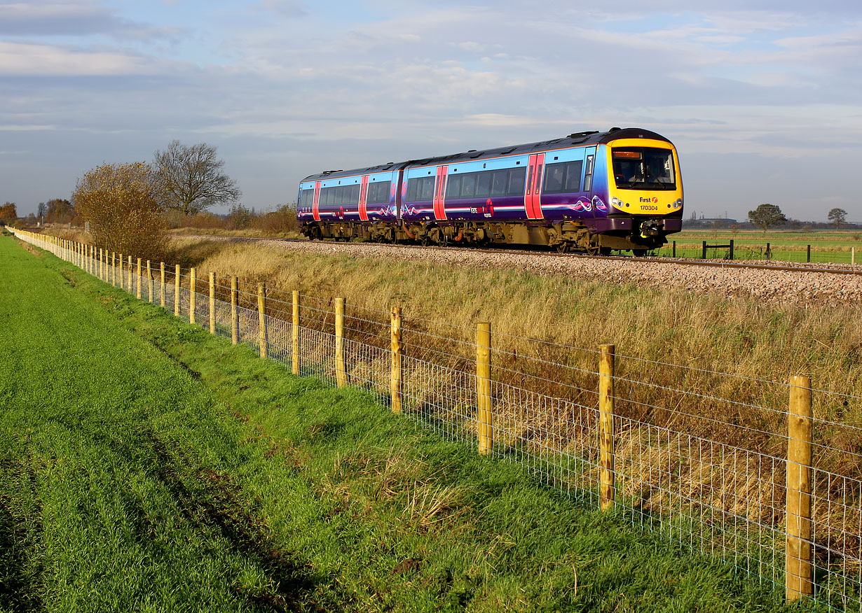 Superb autumnal lighting at Maud's Bridge on 24 November 2011 as 170304 heads eastwards with the 1B68 07:53 Manchester Airport to Cleethorpes First TransPennine service. Just out of sight to the right, another wind farm was being constructed.