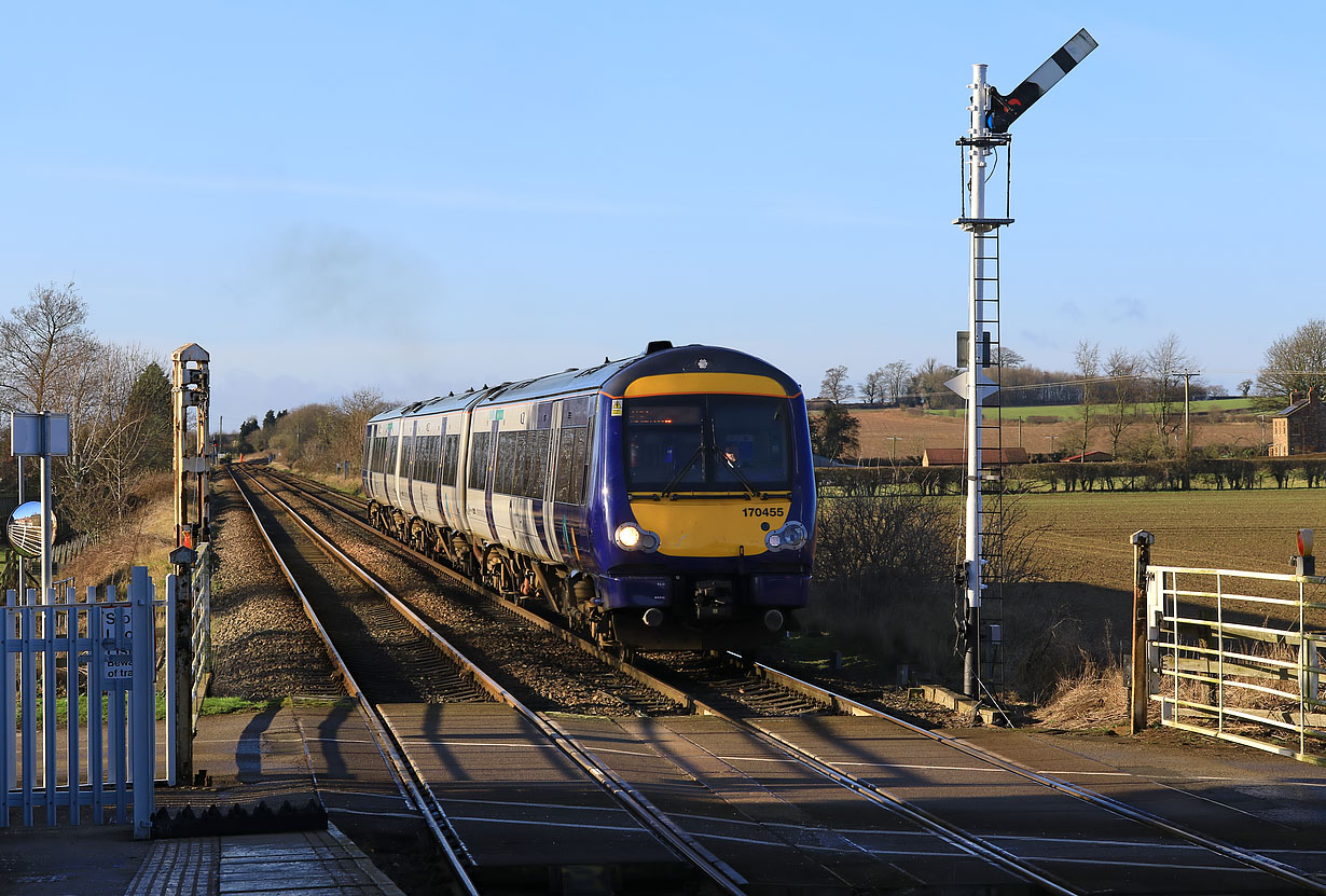 170455 approaches Hammerton station on 18 January 2020 with the late running 2C28 11:29 Leeds to York Northern service. The Knaresborough to York line is a haven of semaphore signalling and traditional level crossings.