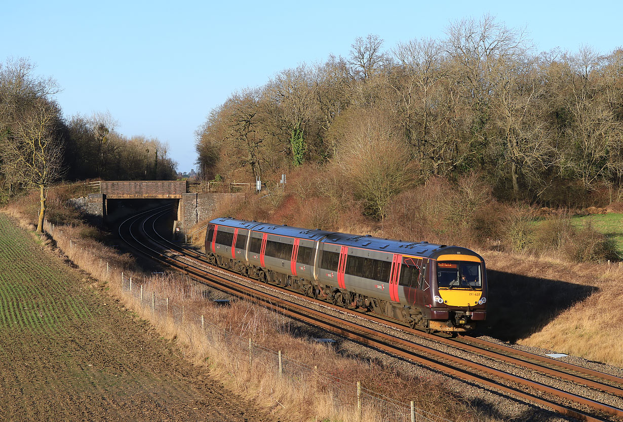 170637 passes Croome on 9 January 2024 with the 1V09 12:07 Nottingham to Cardiff Central CrossCountry service. The red and brown livery almost matches the range of colours in the countryside at this time of year.