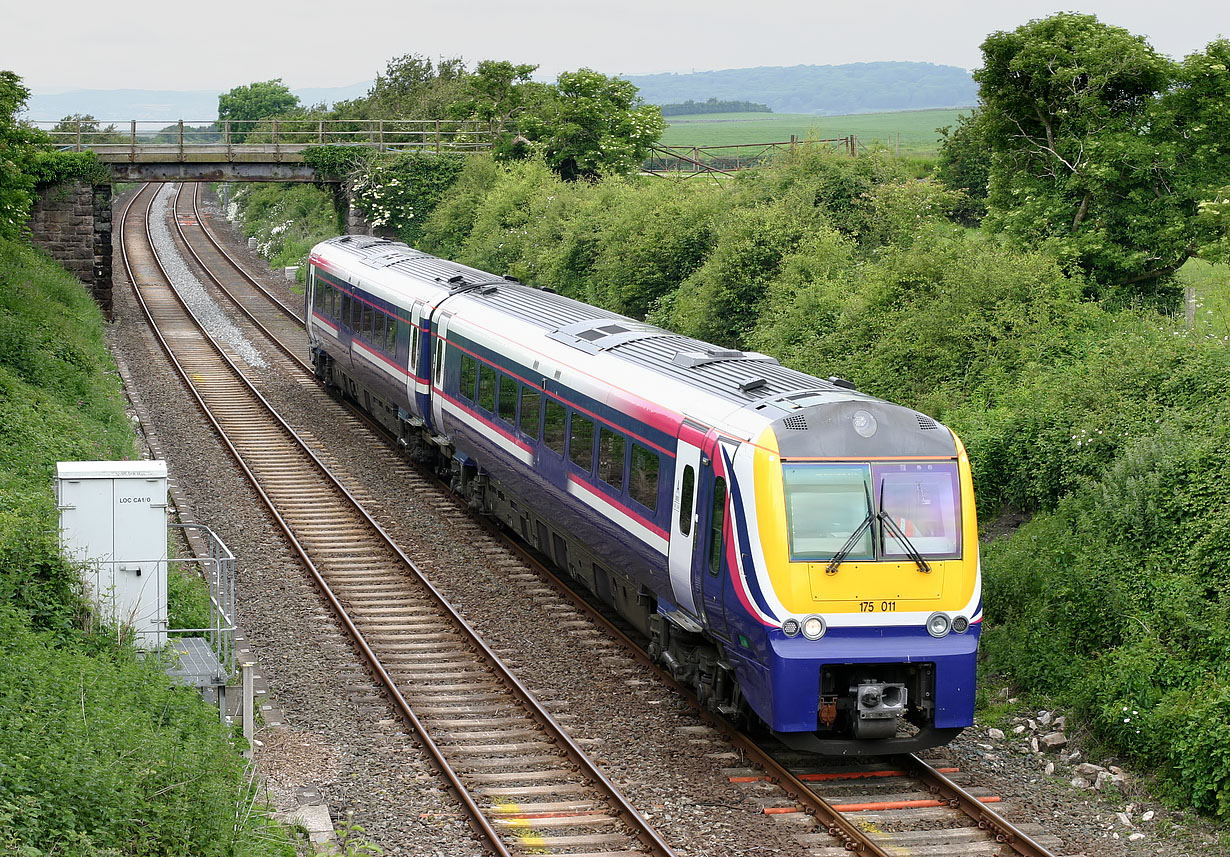 175011 passes Warton on 9 June 2005 with the 12:50 Grange-over-Sands to Manchester Airport TransPennine Express service. This is on the low lying marshy area next to the River Keer, just to the north of Carnforth.