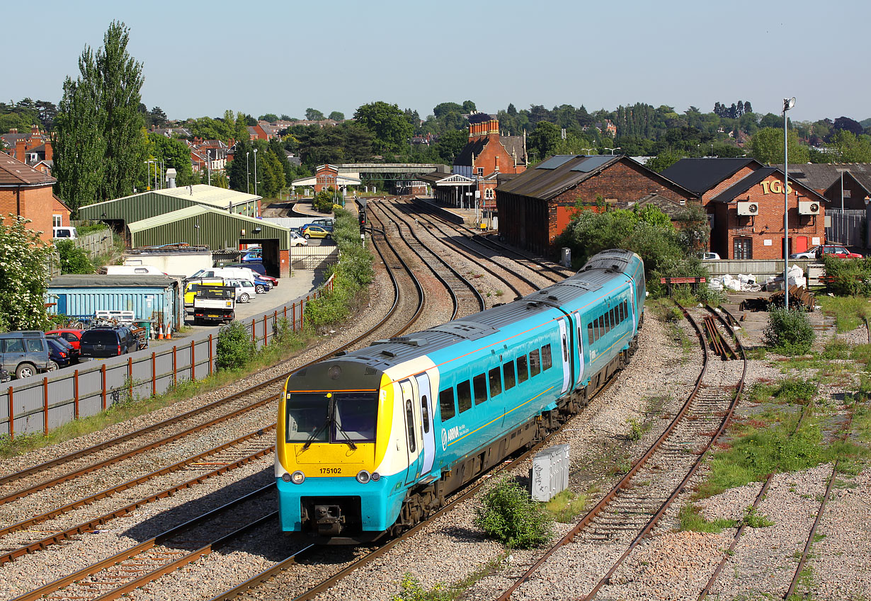 175102 pulls away from Hereford station with the 13:10 Milford Haven to Manchester Piccadilly Arriva Trains Wales service on 2 June 2009. Hereford retains a lot of old railway infrastructure, with the imposing station building and goods shed visible in this view. Plenty of trackwork too, but unfortunately no longer any originating freight traffic. |