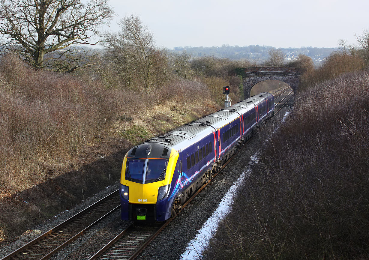 With snow still lying beside the track in the shadow of the bushes, 180102 passes Shorthampton on 3 February 2015 with the 1W29 11:20 Paddington to Malvern First Great Western service. This will soon revert to the overgrown state that the line was in before it was redoubled. |