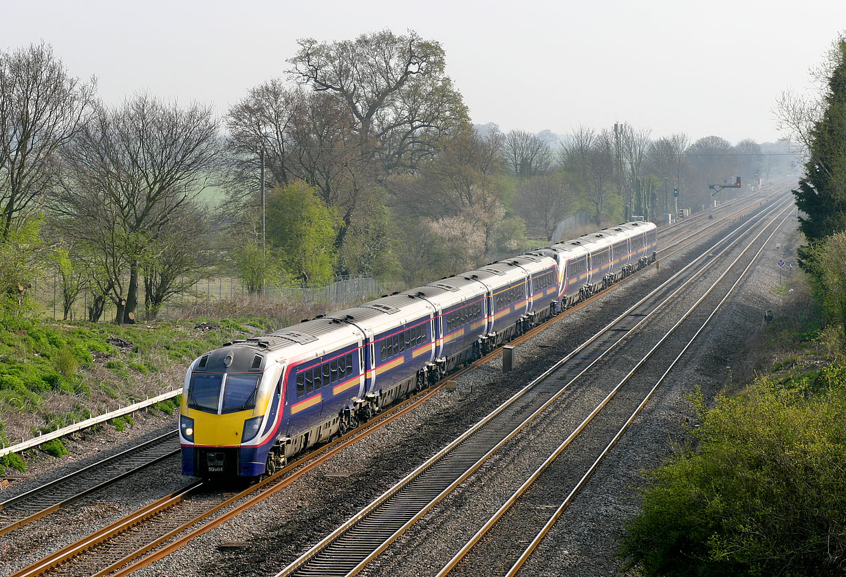 A pair of de-branded First Great Western 'Adelantes' 180104 & 180108 move slowly along the down relief line at Ruscombe on 17 April 2008, after weaving across from the main line and consequently being held up by the stopping train in front. Pairs of Class 180s working together were never common, but during their final days with the franchise seem to be happening more regularly. This is presumably an empty stock move. |