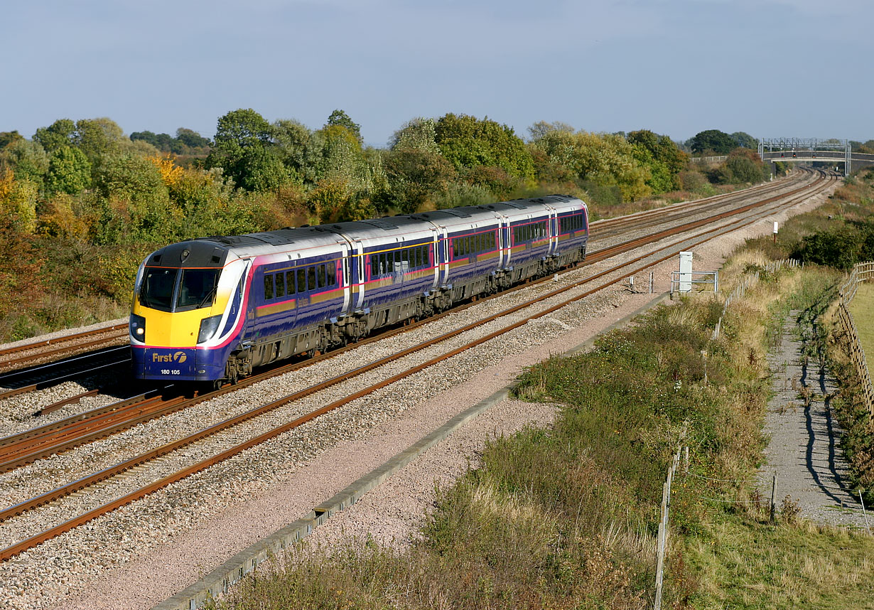 180105 speeds along the Great Western Main Line at Circourt Bridge, Denchworth with the 13:30 Paddington to Cardiff Central First Great Western service on 9 October 2003. Their reign on these services was short lived, with the majority reverting to HSTs, while the 180s were concentrated on the Cotswold line and Paddington to Oxford services. |