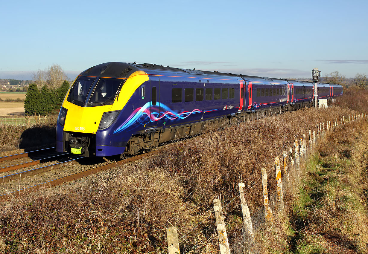 180106 passes Chilson on 1 December 2016 with the 1W29 11:20 Paddington to Great Malvern GWR service. The lichen encrusted fence in the foreground adds to the picture, and is definitely preferable to Network Rail's modern equivalent! Houses in the village of Chadlington can just been seen in the background. |