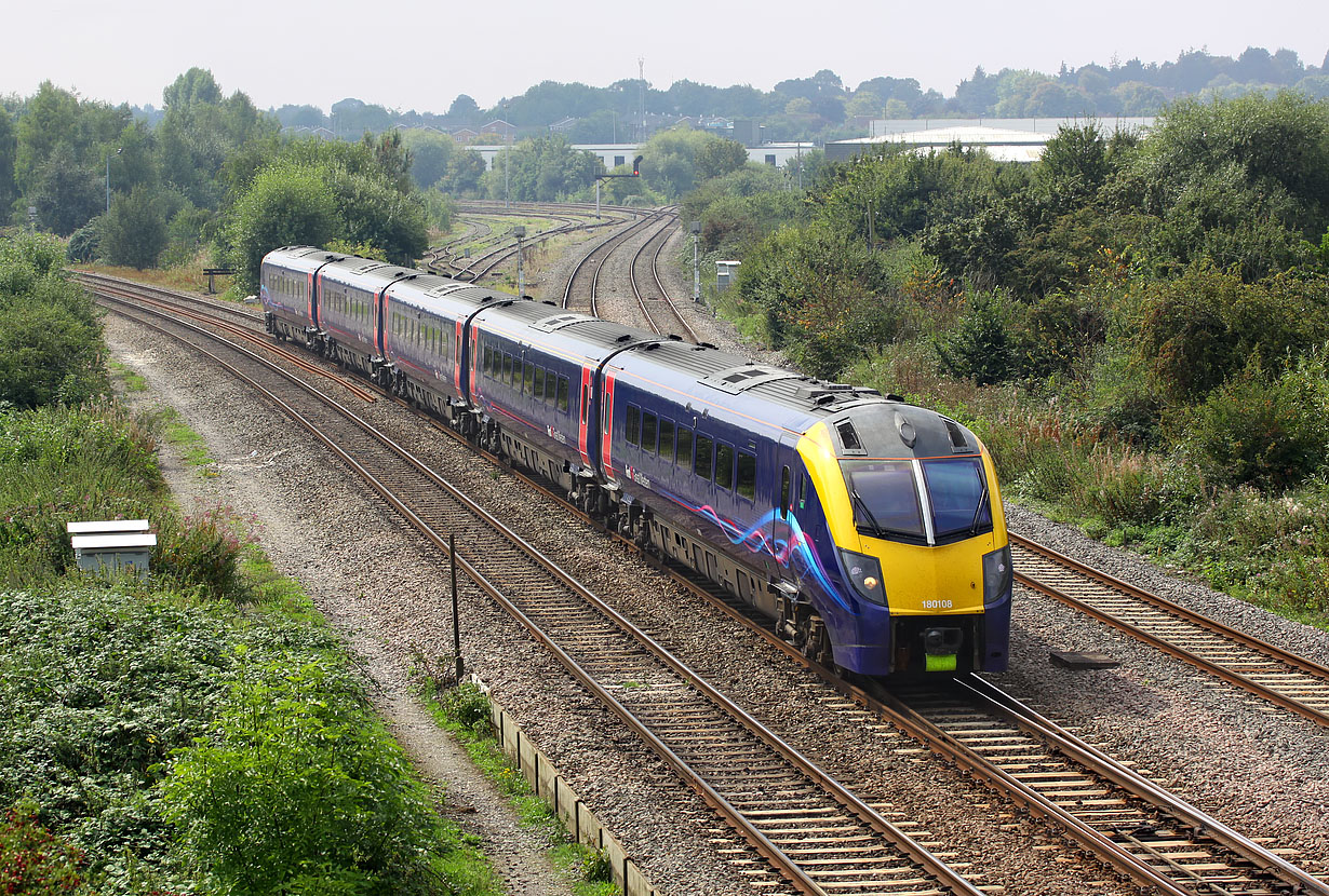 As the train does not call at Didcot, 180108 makes use of Didcot's east curve, and approaches Didcot North Junction on 3 September 2014 with the 1W29 11:20 Paddington to Great Malvern First Great Western service.